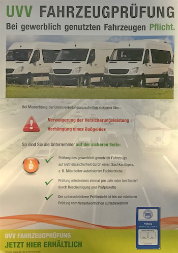 - Prüfung des gewerblich genutzten Fahrzeugs auf Betriebssicherheit durch einen Sachkundigen, z. B. Mitarbeiter autorisierter Fachbetriebe